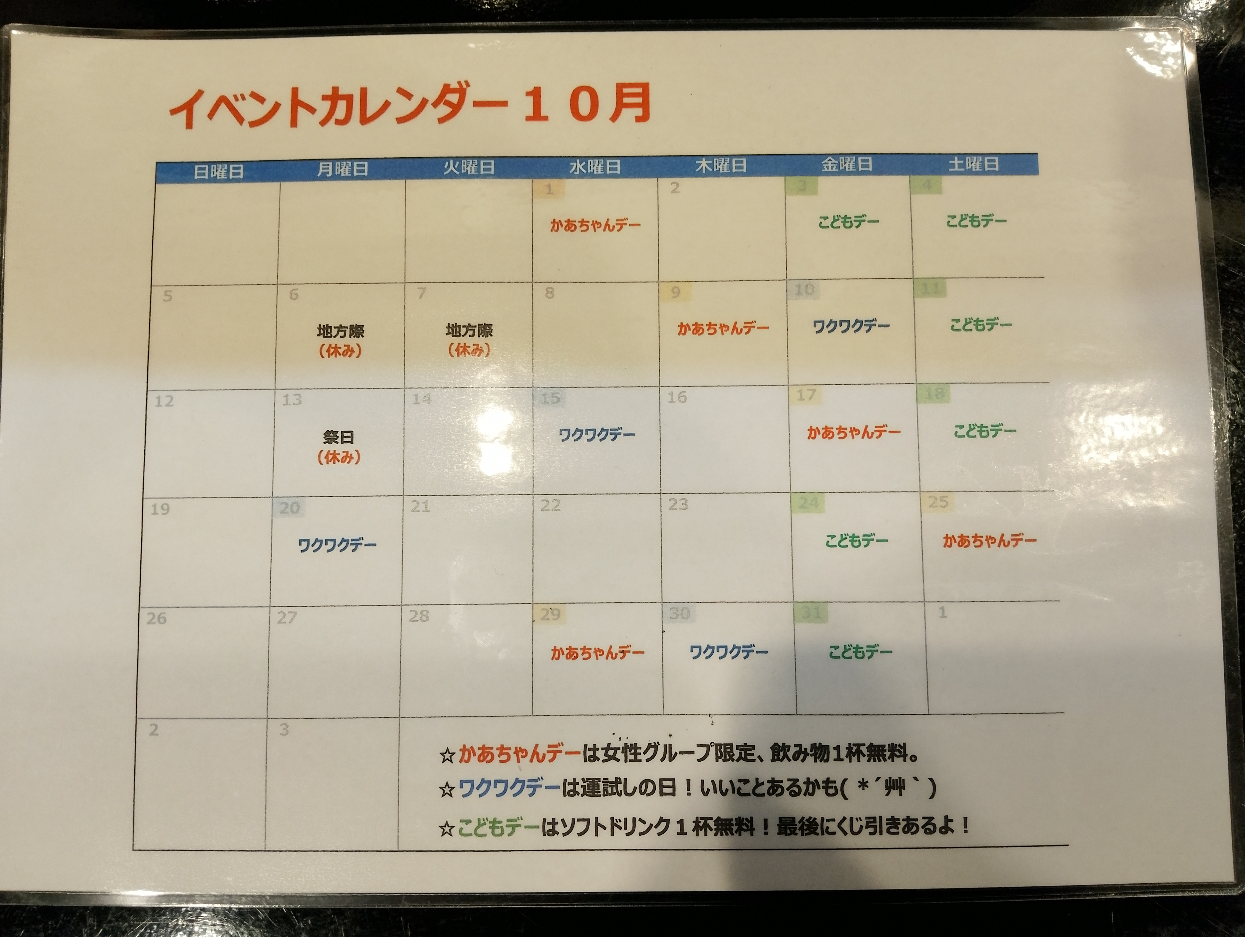 かあちゃんデーは女性グループ限定飲み物1杯無料🍻 ワクワクデーは運試しの日💪 子供デーはソフトドリンク1杯無料🍹 最後にくじ引きあるよ